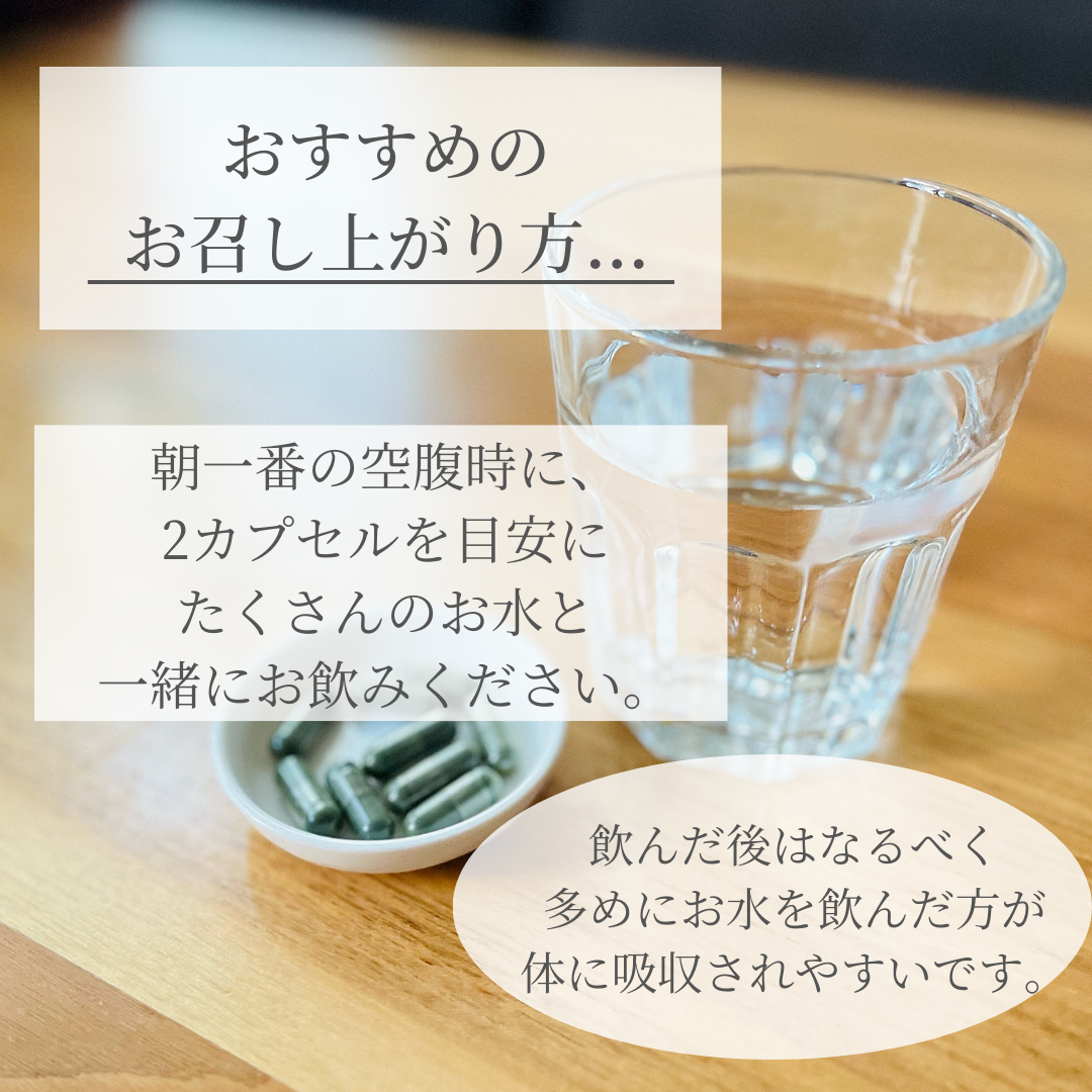 朝一番の空腹時に、2カプセルを目安にたくさんのお水と一緒にお飲みください。
