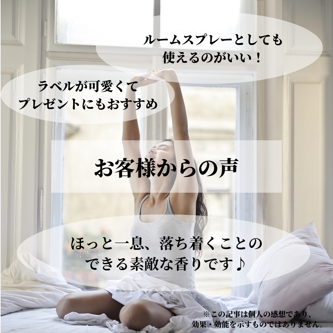 天然の精油と、エタノールを使用しない製法にこだわり、7種類以上の精油の個性を活かしたことにより、香水のように複雑で奥深い香りを実現。