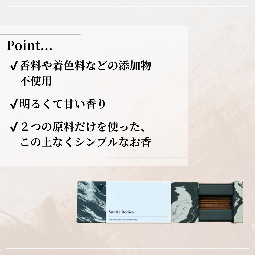 香料を使っていないパロサントのみを使用し、豊富でありながら繊細な香りを放ちます。お香立てなどを使ってお使いいただけますと、よりきれいにお使いいただけます。