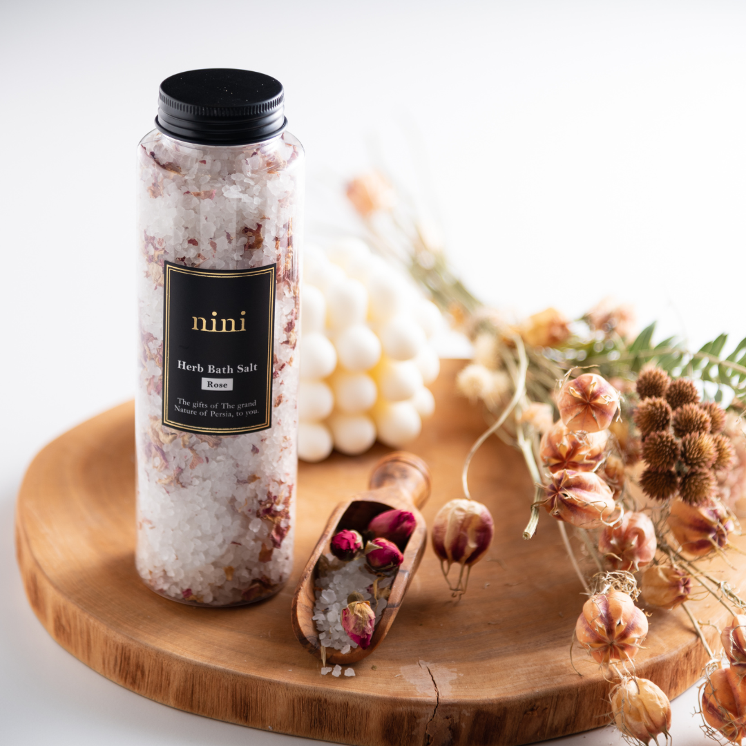 nini ハーブバスソルトは、この貴重な天然塩をベースに、日本人の繊細な肌に合わせた100%ナチュラル処方。湯船に溶かせば、天然ミネラルと心地よい温浴効果とともに肌をやさしく包み込み、しっとりなめらかに整えます。
